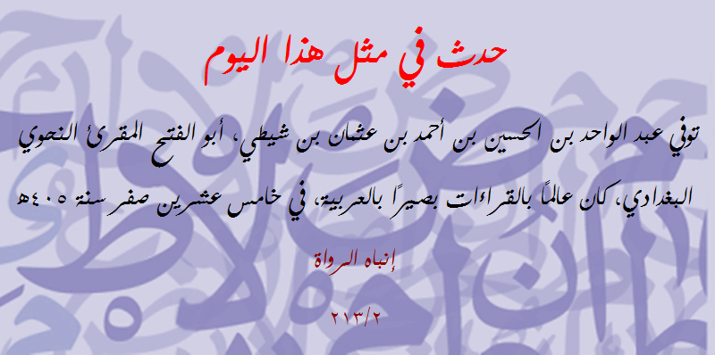 | حدث في مثل هذا اليوم (195): توفي أبو محمد ابن أبي الحسن المقرئ النحوي البغدادي | مصطفى شعبان | مشاركات مفتوحة في علوم (( اللغة العربية )) | 0 | 07-12-2018 10:37 AM |