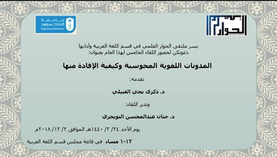 كُتب : [ 12-03-2018 - 01:13 PM ] المدونات اللغوية المحوسبة موضوع مهم جدا |