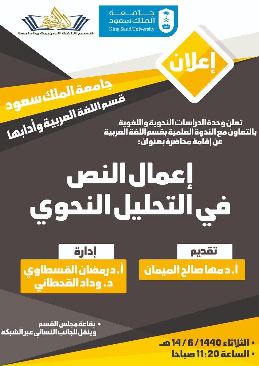 تعلن وحدة الدراسات النحوية واللغوية بقسم اللغة العربية بجامعة الملك سعود بالتعاون مع الندوة العلمية عن إقامة ندوة: