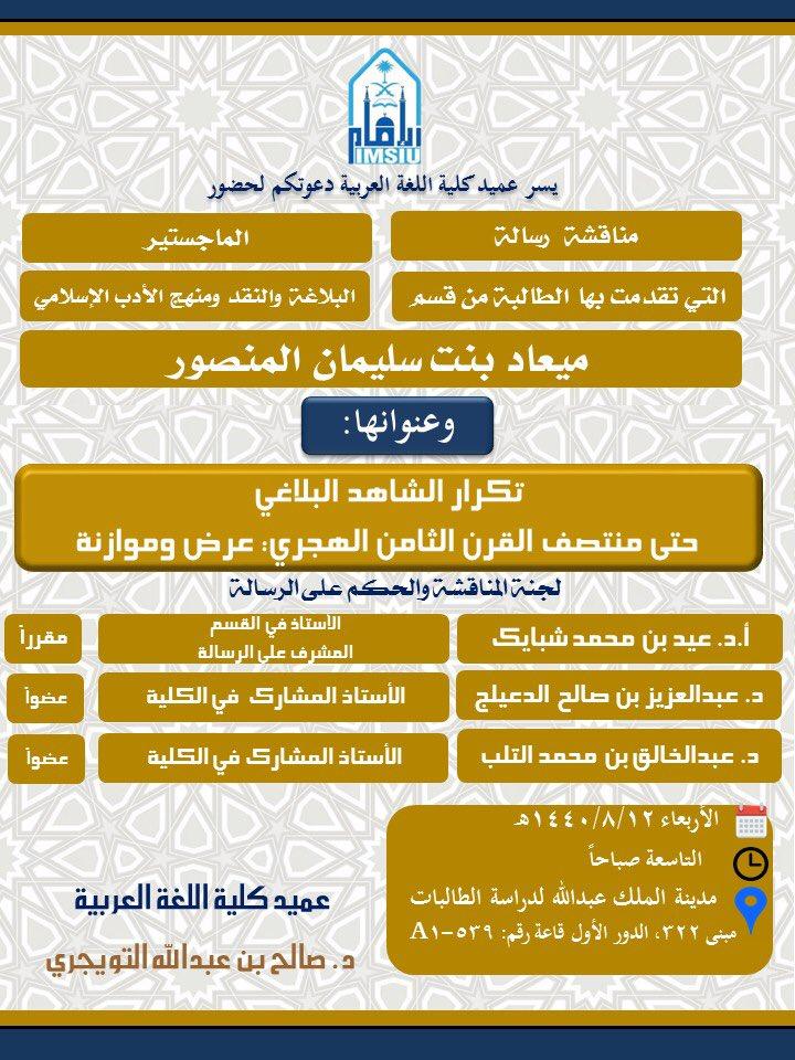 | مناقشة ماجستير: المتغيرات الثقافية في الرواية السعودية(1422 - 1436 هـ) بجامعة الإمام | مصطفى شعبان | أخبار ومناسبات لغوية | 0 | 04-04-2019 05:26 AM |