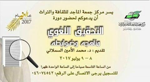 ينظم مركز جمعة الماجد للثقافة والتراث دورة بعنوان التدقيق اللغوي- مناهجه وضوابطه يقدمها د. محمد الأمين السملالي وذلك في الساعة التاسعة صباحا من يومي 8-9 يوليو الجاري.