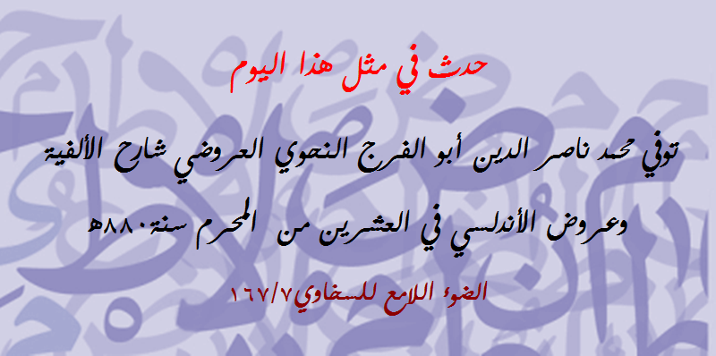 | حدث في مثل هذا اليوم (91): توفي شمس الدين القويضي الفقيه النحوي العروضي | مصطفى شعبان | مشاركات مفتوحة في علوم (( اللغة العربية )) | 0 | 11-28-2017 06:39 AM |