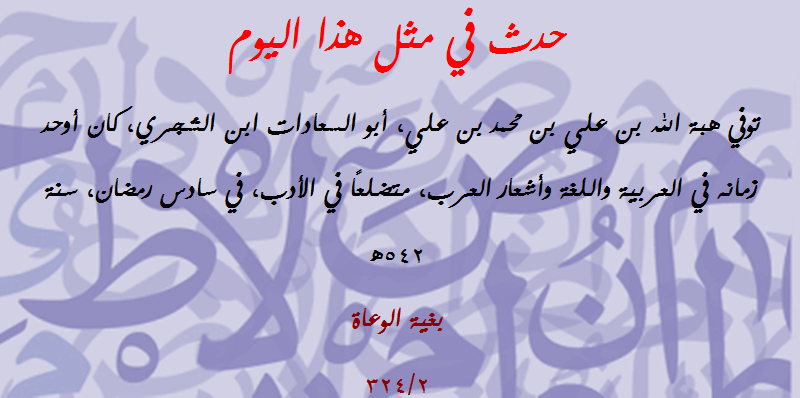 | حدث في مثل هذا اليوم (115): توفي ابن أبي خلف النحوي اللغوي الهمذاني | مصطفى شعبان | مشاركات مفتوحة في علوم (( اللغة العربية )) | 0 | 02-15-2018 12:06 PM |