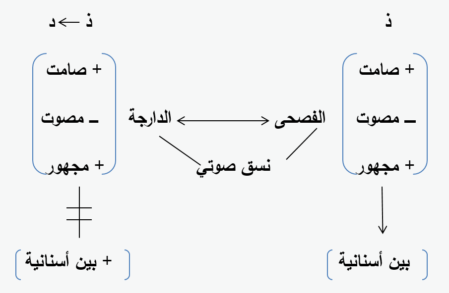 والرسم التالي يوضح السمات المميزة لحرف الذال، وتَمَظْهُرات التداخل الصوتي بين الدارجة المغربية والعربية الفصحى.