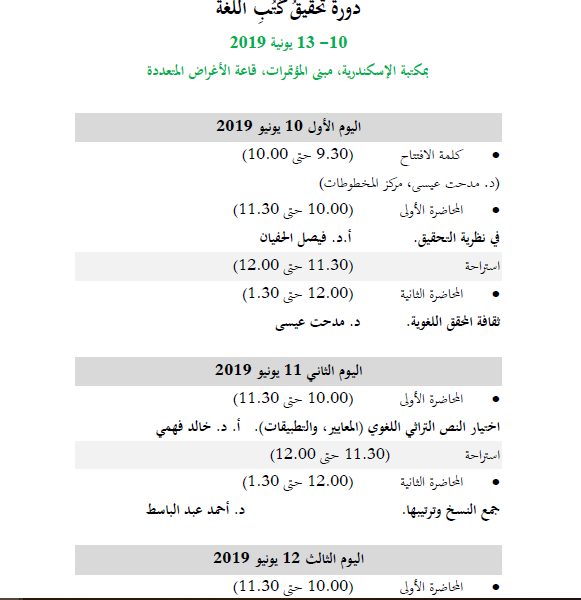 | مكتبة الإسكندرية تنظم دورة "تحقيق النصوص: قضايا ومشكلات" | مصطفى شعبان | أخبار ومناسبات لغوية | 0 | 11-10-2019 07:03 AM |