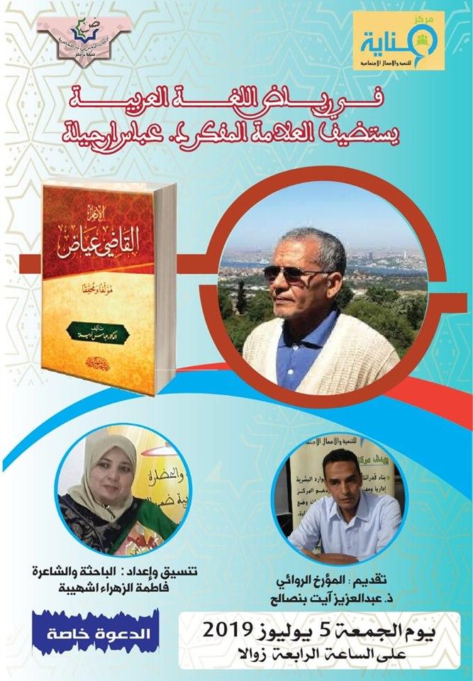 تنظم تنسيقية الائتلاف من أجل اللغة العربية بمراكش بشراكة مع مركز عناية يوم الجمعة 5 يوليوز 2019 ابتداء من الساعة الرابعة بعد الزوال دورة جديدة من رياض اللغة العربية يستضيف العلامة المفكر والأديب الكبير سيدي عباس ارحيلة. وتعرف هذه الدورة سيساهم مركز عناية في التنظيم، ببصمة خاصة حيث سيخرج الملتقى من الفضاءات الرسمية المغلقة إلى المجالس العلمية الخاصة.