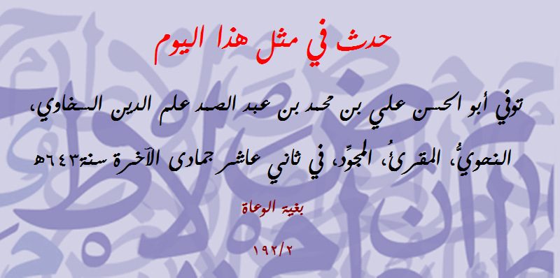 | حدث في مثل هذا اليوم (136): توفي شمس الدين الغماري النحوي المقرئ المالكي | مصطفى شعبان | مشاركات مفتوحة في علوم (( اللغة العربية )) | 0 | 03-28-2018 07:45 AM |