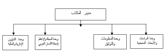 الهيكل التنظيمي للمكتب: بنية المكتب العامة، وتتألف من الوحدات الآتية: وحدة الدراسات والأبحاث المصطلحية والمعجمية، ووحدة التخطيط والمشروعات والمتابعة، ووحدة الشبكة المعلوماتية، ووحدة التوثيق والإعــلام (مجلة اللسان العربي)، ووحدة الشؤون الإدارية والمالية.