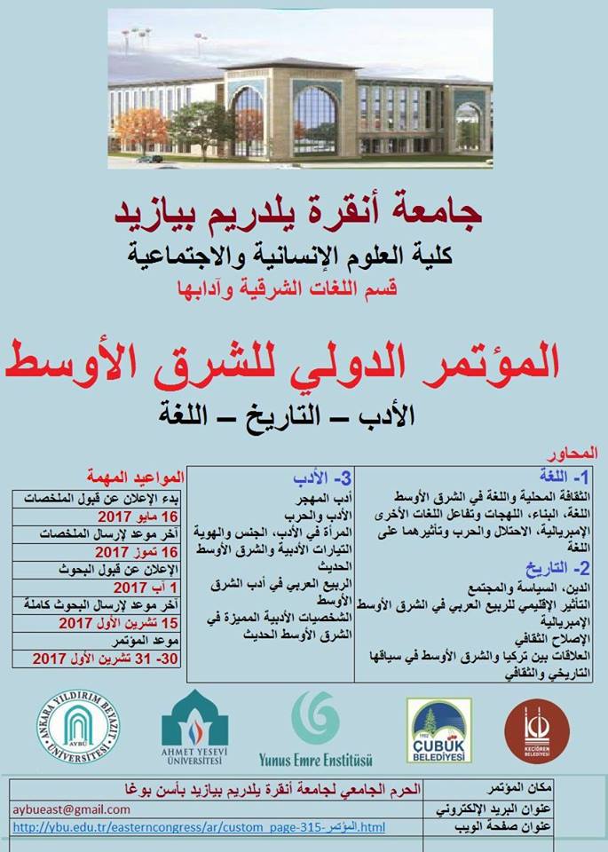 تحت رعاية جامعة أنقرة يلدريم بيازيد، كلية العلوم الإنسانية والاجتماعية، قسم اللغات الشرقية وآدابها، ستنظم الجامعة مؤتمراً دولياً بعنوان " المؤتمر الدولي للشرق الأوسط – اللغة – التاريخ – الأدب بتاريخ 31-30 تشرين الأول\أكتوبر" وسيهدف المؤتمر إلى معالجة ووضع منطقة الشرق الأوسط وفق سياقها التاريخي والأدبي واللغوي وسيطرة وهيمنة الحضارات المختلفة والمعتقدات واللغات، فقارة آسيا تمتلك موقعاً استراتيجياً، فهي تربط قارتي أفريقيا وأوربا، فضلاً عن الموارد الطبيعية والعناصر الأساسية المختلفة وهذا ما جعلها تتحول إلى ساحات للصراع والنزاع. فنحن نعيش أكثر الفترات فوضوية في تاريخ الشرق الأوسط.