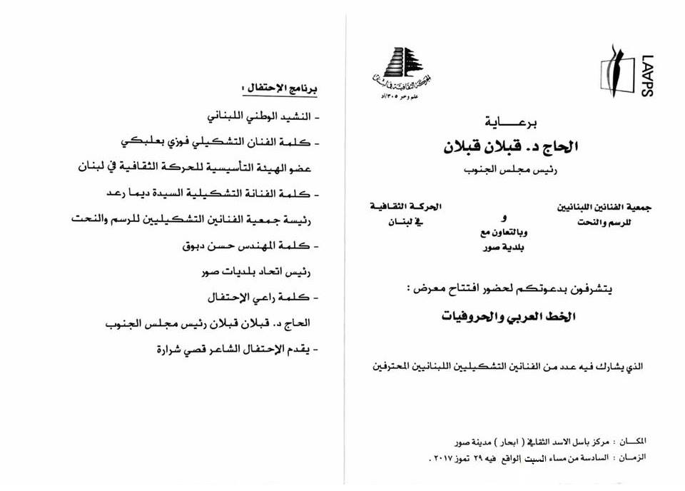 تنظم جمعية الفنانين اللبنانيين للرسم والنحت والحركة الثقافية في لبنان,وبلدية صور معرض الخط العربي والحروفيات والذي يشارك فيه عدد من اللبنانيين التشكيليين اللبنانيين المحترفين، ويبدأ حفل الافتتاح بالنشيد الوطني ثم كلمة الفنان التشكيلي فوزي بعلبكي عضو الهيئة التأسيسة للحركة الثقافية في لبنان وكلمة الفنانة التشكيلية ديما رعد رئيسة جمعية الفنانين التشكيليين للرسم والنحت وكلمة المهندس حسن دبوق رئيس اتحاد بلديات صور، وكلمة راعي الاحتفال قبلان قبلان رئيس مجلس الجنوب ، ويقدم الاحتفالية الشاعر قصي شرارة.