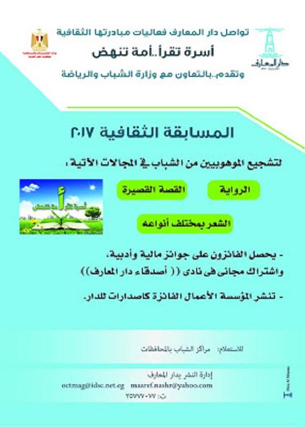 تنظم وزارة الشباب والرياضة بالتعاون مع مؤسسة دار المعارف المسابقة الثقافية لعام 2017 تحت شعار "العمل الأول للموهبين في المجالات الأدبية" (الرواية / القصة القصيرة/الشعر بجميع انواعه) فـــي إطار مبادرة "اسرة تقرأ ...أمة تنهض .." في إطار اهتمام وزارة الشباب والرياضة بتنمية المواهب الثقافية والأدبية للشباب لإتاحة الفرصة لهم للتعبير عن رؤيتهم الأدبية والثقافية واكتشاف المواهب الشابة في المجالات الأدبية ..