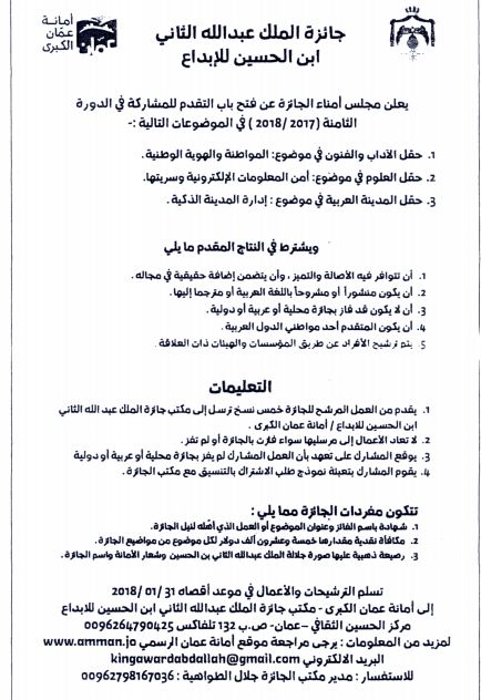 أعلنت الأردن تفاصيل الدورة التاسعة لجائزة الملك عبد الله الثانى بن الحسين للإبداع للعام 2017 – 2018، مع فتح باب المشاركة فيها أمام كافة المبدعين العرب، وتستقبل الجائزة المشاركات حتى 31يناير 2018.
