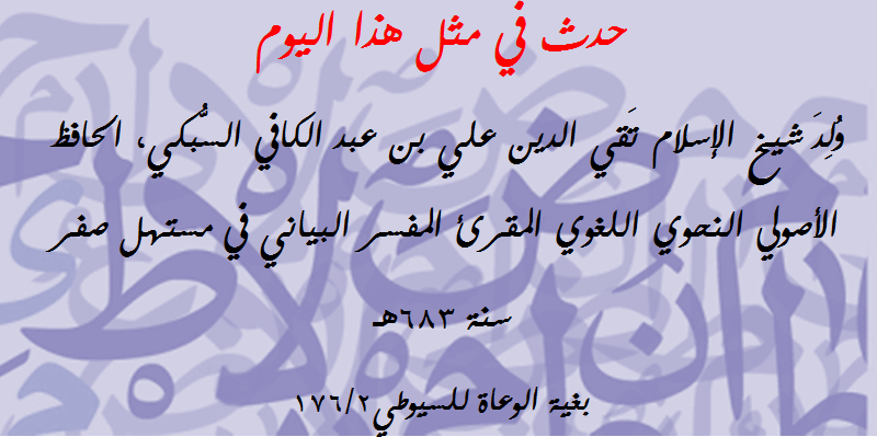 | حدث في مثل هذا اليوم (127): ولد العلامة بهاء الدين السبكي البلاغي البياني اللغوي | مصطفى شعبان | مشاركات مفتوحة في علوم (( اللغة العربية )) | 0 | 03-08-2018 10:49 AM |