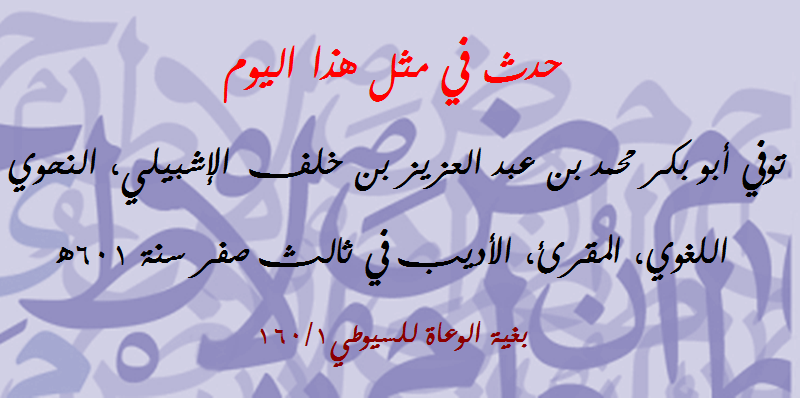 | حدث في مثل هذا اليوم (245): توفي أبو بكر ابن خلف الإشبيلي النحوي اللغوي الأديب | مصطفى شعبان | مشاركات مفتوحة في علوم (( اللغة العربية )) | 0 | 10-13-2018 07:38 AM |