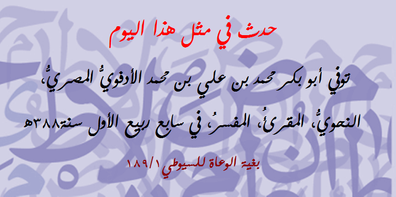 | حدث في مثل هذا اليوم (263): توفي أبو بكر الأدفوي المصري النحوي المقرئ | مصطفى شعبان | مشاركات مفتوحة في علوم (( اللغة العربية )) | 0 | 11-15-2018 03:59 PM |