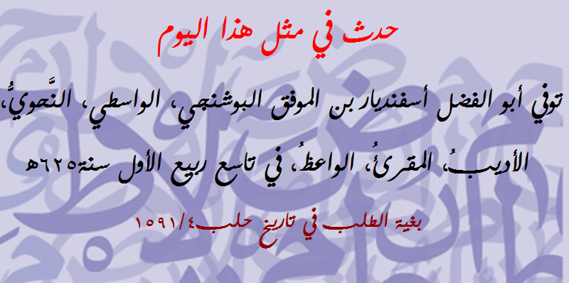 | حدث في مثل هذا اليوم (230):توفي إبراهيم بن محمد التنوخي الغرناطي النحوي المقرئ الأديب | مصطفى شعبان | مشاركات مفتوحة في علوم (( اللغة العربية )) | 0 | 09-17-2018 05:37 PM |