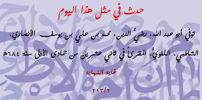 | حدث في مثل هذا اليوم (159): توفي ابن الزوال اللغوي الأديب المقرئ | مصطفى شعبان | مشاركات مفتوحة في علوم (( اللغة العربية )) | 0 | 05-05-2018 10:50 AM |