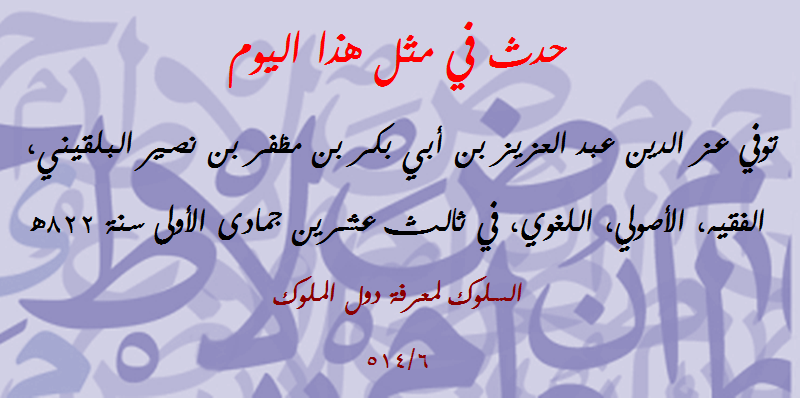 | حدث في مثل هذا اليوم (209): توفي عز الدين المدلجي النحوي الفقيه الأصولي | مصطفى شعبان | مشاركات مفتوحة في علوم (( اللغة العربية )) | 0 | 08-12-2018 07:09 PM |