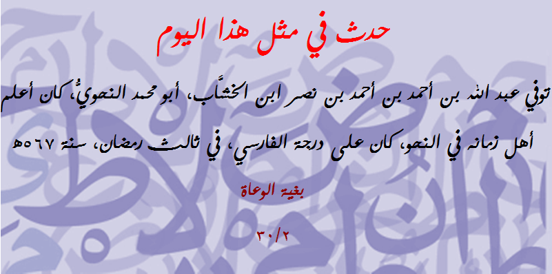 | حدث في مثل هذا اليوم(261):توفي أبو محمد القاسم بن منصور الواسطي النحوي اللغوي الأديب | مصطفى شعبان | مشاركات مفتوحة في علوم (( اللغة العربية )) | 0 | 11-12-2018 09:02 AM |