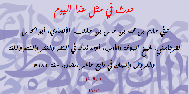 | حدث في مثل هذا اليوم (234): توفي أبو الحسن البغدادي الأديب الفاضل الحكيم | مصطفى شعبان | مشاركات مفتوحة في علوم (( اللغة العربية )) | 0 | 09-23-2018 12:04 PM |