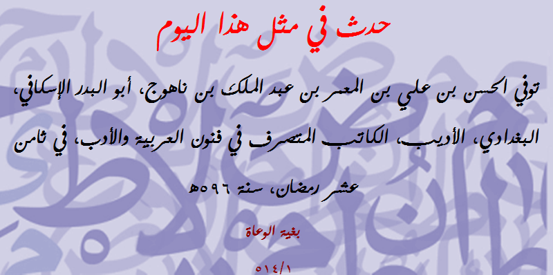 | حدث في مثل هذا اليوم (208): توفي أبو الحسن البغدادي الأديب | مصطفى شعبان | مشاركات مفتوحة في علوم (( اللغة العربية )) | 0 | 08-05-2018 10:19 AM |