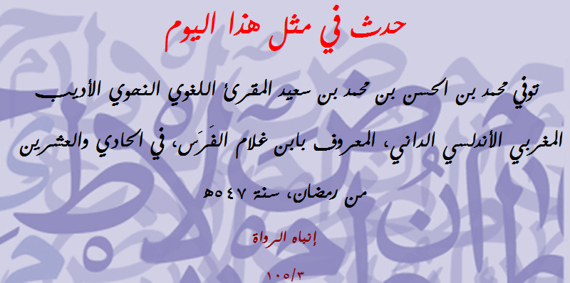| حدث في مثل هذا اليوم (226): توفي أبو طاهر بن عمران النحوي المقرئ الأندلسي | مصطفى شعبان | مشاركات مفتوحة في علوم (( اللغة العربية )) | 0 | 09-11-2018 01:31 PM |