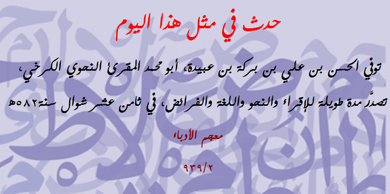 | حدث في مثل هذا اليوم (195): توفي أبو محمد ابن أبي الحسن المقرئ النحوي البغدادي | مصطفى شعبان | مشاركات مفتوحة في علوم (( اللغة العربية )) | 0 | 07-12-2018 10:37 AM |