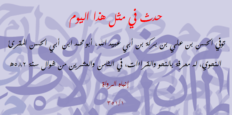 | حدث في مثل هذا اليوم (219): توفي نور الدين أبو الحسن اللخمي المقرئ النحوي المصري | مصطفى شعبان | مشاركات مفتوحة في علوم (( اللغة العربية )) | 0 | 08-30-2018 03:23 PM |
