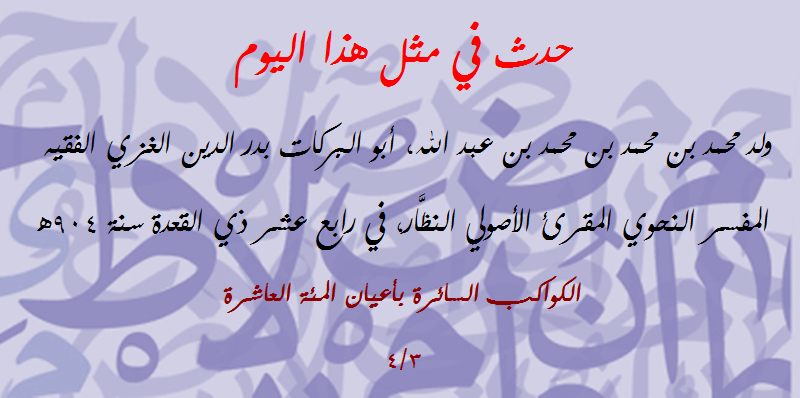 | حدث في مثل هذا اليوم (108): توفي نور الدين الزرندي المدني النحوي المفسر | مصطفى شعبان | مشاركات مفتوحة في علوم (( اللغة العربية )) | 0 | 12-31-2017 06:00 AM |
