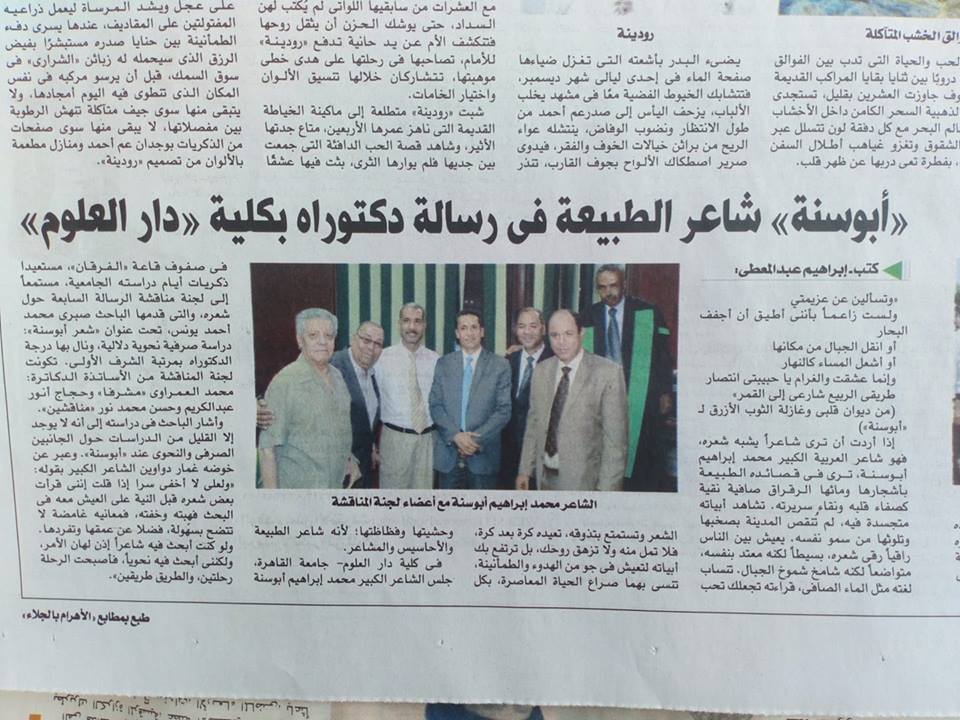 نوقشت رسالة الدكتوراه المقدمة من الباحث صبري يونس في" شعر أبو سنة دراسة صرفية نحوية دلالية "، بإشراف العالم الجليل الأستاذ الدكتور محمد العمراوي، وعضوية الأستاذ الدكتور حسن نور، ومناقشة الأستاذ الدكتور حجاج أنور عبد الكريم بحضور الشاعر الكبير محمد إبراهيم أبو سنة.