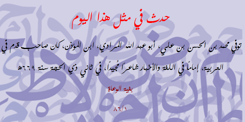 | حدث في مثل هذا اليوم (257): توفي أبو عبد الله ابن سعادة الغرناطي اللغوي النحوي الأديب | مصطفى شعبان | مشاركات مفتوحة في علوم (( اللغة العربية )) | 0 | 11-04-2018 07:32 AM |