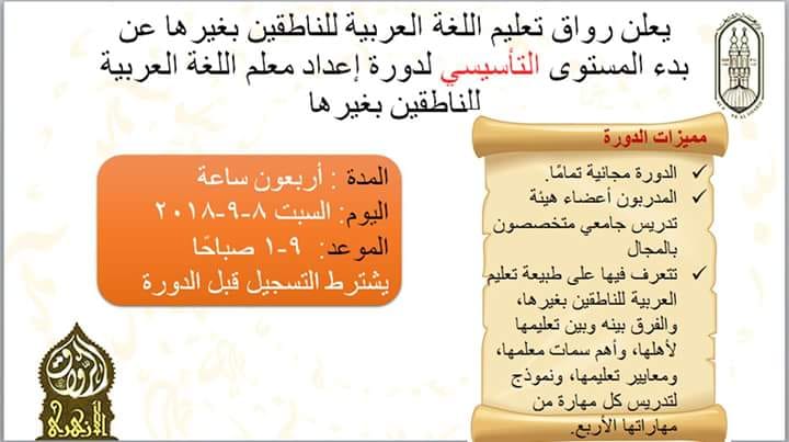| الرواق الأزهري يعلن عن الدورة التأسيسية لإعداد معلم اللغة العربية للناطقين بغيرها | مصطفى شعبان | أخبار ومناسبات لغوية | 0 | 06-23-2017 10:44 AM |