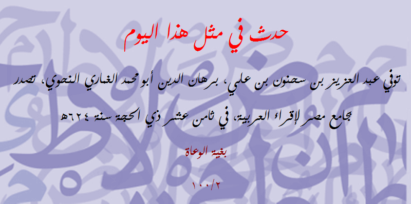 | حدث في مثل هذا اليوم (270): توفي برهان الدين أبو إسحاق الصنهاجي النحوي المالكي | مصطفى شعبان | مشاركات مفتوحة في علوم (( اللغة العربية )) | 0 | 11-27-2018 08:48 AM |