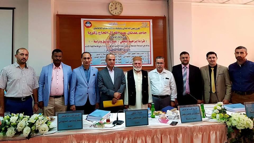 نوقش آخر أيام العام الهجري 1439 ، ((الاثنين 30 ذي الحجة 1439هجرية ، 10أيلول 2018ميلادية)) الباحث(( حامد عدنان عبدالله آل الحاج زكريا)) في رسالته للماجستير (( قراءة إبراهيم النخعي _ جمع وتوثيق ودراسة )) التي أنجزها بإشراف أ.د عبد الستار فاضل في قسم اللغة العربية في كلية الآداب في جامعة الموصل، وتالفت لجنة مناقشته من الأستاذ الفاضل الدكتور دلدار عبدالغفور حمد من كلية اللغات في جامعة صلاح الدين في أربيل رئيسا ، والأستاذ الفاضل الدكتور محمد إسماعيل المشهداني من كلية التربية للبنات في جامعة الموصل عضوًا ، والأستاذ الفاضل الدكتور خالد علي سليمان من كلية الآداب في جامعة الموصل عضوًا.