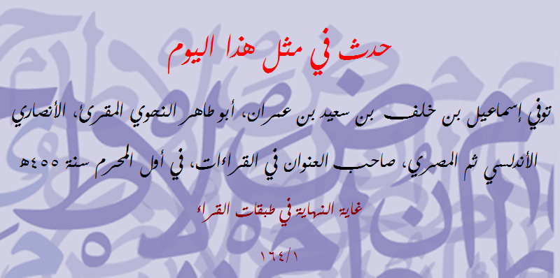 | حدث في مثل هذا اليوم (175): توفي أبو داود الأندلسي المقرئ شيخ الإقراء ومسند القراء | مصطفى شعبان | مشاركات مفتوحة في علوم (( اللغة العربية )) | 0 | 06-01-2018 11:56 AM |