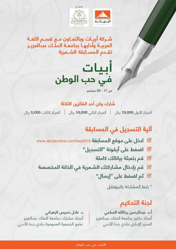 | أمسية شعرية بنادي جدة الأدبي للشعراء الفائزين في مسابقة (أبيات في حب الوطن) | مصطفى شعبان | أخبار ومناسبات لغوية | 0 | 10-10-2018 09:02 AM |