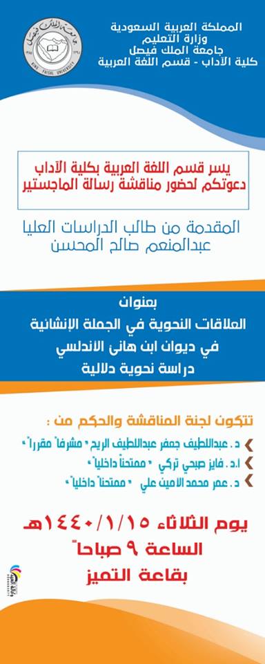 | مناقشة ماجستير: "الحال والنعت في ديوان ذي الرمة دراسة نحوية دلالية" بجامعة الملك فيصل | مصطفى شعبان | أخبار ومناسبات لغوية | 0 | 12-10-2018 09:13 AM |