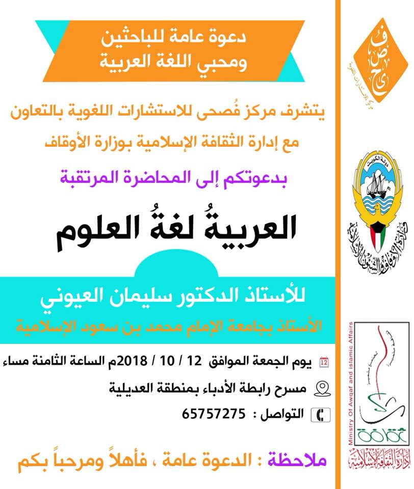 | "العربية علم ومتعة".. محاضرة يعقدها مركز فصحى للاستشارات اللغوية بالكويت | شمس | أخبار ومناسبات لغوية | 2 | 01-31-2018 12:44 PM |