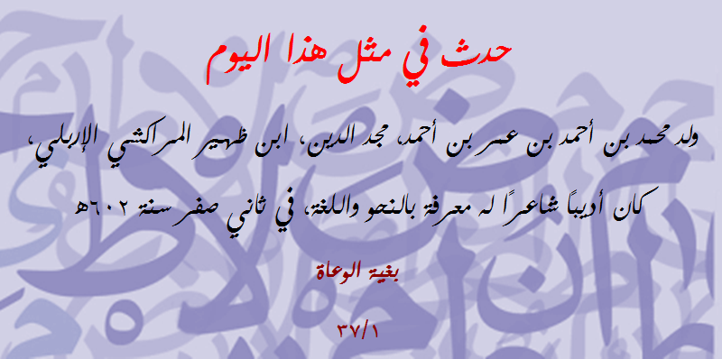 | حدث في مثل هذا اليوم (62): وُلد مجد الدين المراكشي الإربلي النحوي اللغوي الأديب | مصطفى شعبان | مشاركات مفتوحة في علوم (( اللغة العربية )) | 0 | 10-22-2017 05:38 AM |