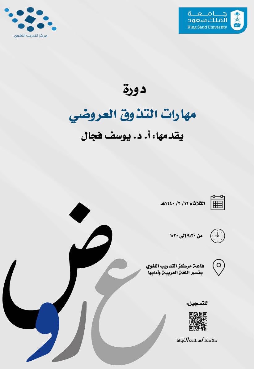 | مركز التدريب اللغوي بجامعة الملك سعود يعلن عن دورة بعنوان: ( النص الحيوي) | مصطفى شعبان | أخبار ومناسبات لغوية | 0 | 03-28-2019 07:01 AM |