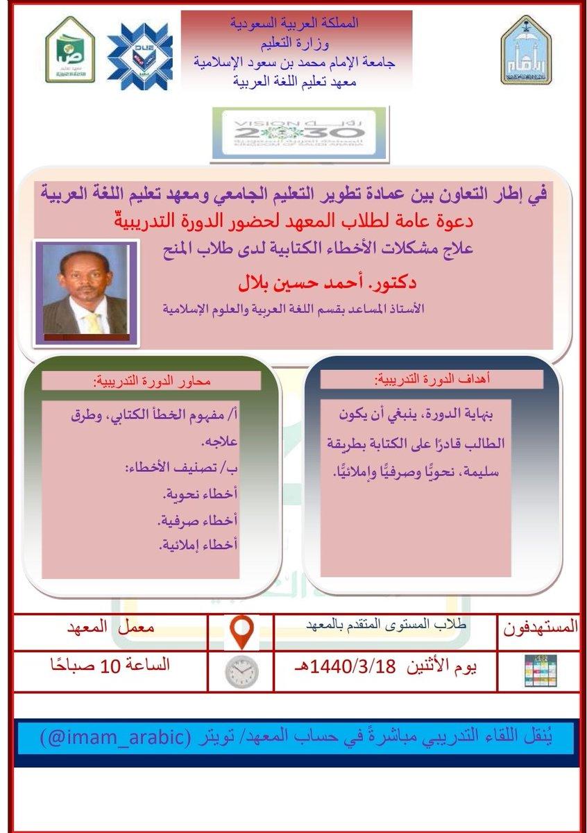| جامعة الإمام تقيم دورة: علاج مشكلات الأخطاء اللغوية الشائعة لغير الناطقين بالعربية | مصطفى شعبان | أخبار ومناسبات لغوية | 0 | 03-02-2019 09:14 AM |