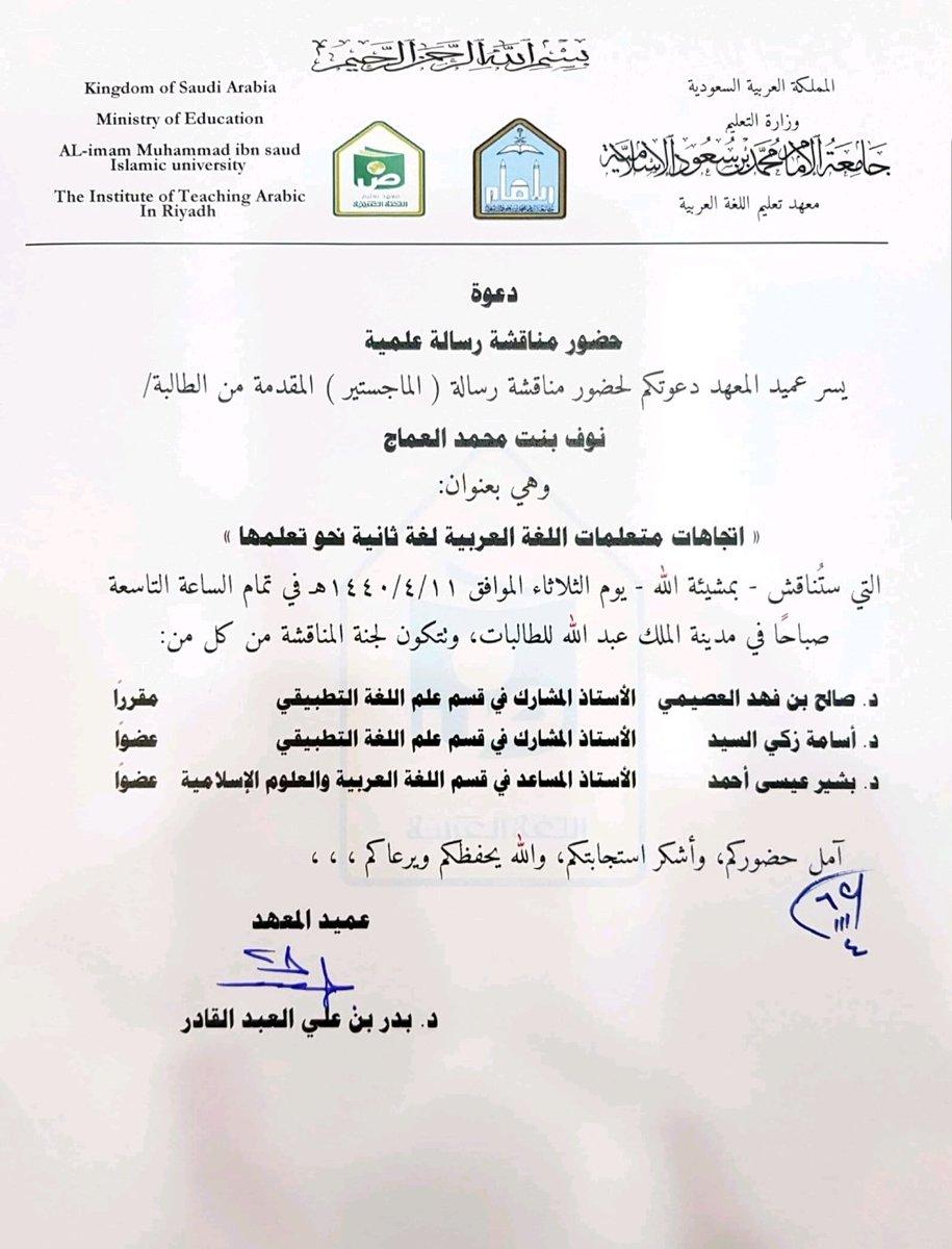 | دعوة لحضور مناقشة رسالة الماجستير" الأم في الرواية السعودية" بجامعة الإمام | مصطفى شعبان | أخبار ومناسبات لغوية | 0 | 09-04-2018 04:54 PM |