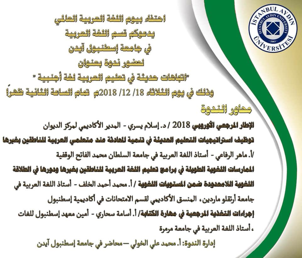 | أكاديمية إسطنبول تقيم دورة بعنوان:"مبادئ وأساليب تعليم اللغة العربية للناطقين بغيرها" | مصطفى شعبان | أخبار ومناسبات لغوية | 0 | 07-22-2018 09:29 AM |