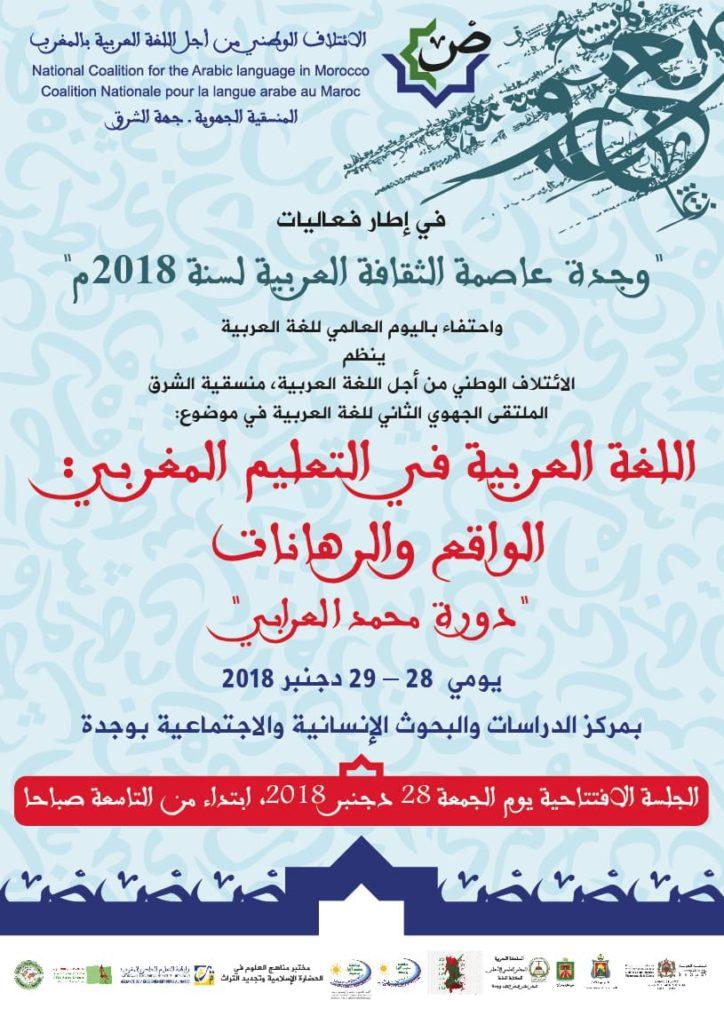 في إطار فعاليات وجدة عاصمة الثقافة العربية لسنة 2018م، وأسبوع اللغة العربية واحتفاء باليوم العالمي للغة العربية، ينظم الائتلاف الوطني من أجل اللغة العربية المنسقية الجهوية للشرق، وتأبينا للأستاذ محمد العرابي، وبشراكة مع وزارة الثقافة والاتصال ومجلس الجهة الشرقية والجماعة الحضرية لوجدة والمجلس العلمي المحلي لوجدة وجامعة محمد الأول والمركز الجهوي لمهن التربية والتكوين وكلية الآداب والعلوم الإنسانية واتحاد كتاب المغرب فرع وجدة ورابطة التعليم الخاص بالمغرب فرع وجدة انكاد الملتقى الجهوي الثاني للغة العربية في موضوع: “اللغة العربية في النظام المغربي: الواقع والرهانات ” يومي 28 و29 دجنبر 2018 بمركز الدراسات والبحوث الإنسانية والاجتماعية وجدة.