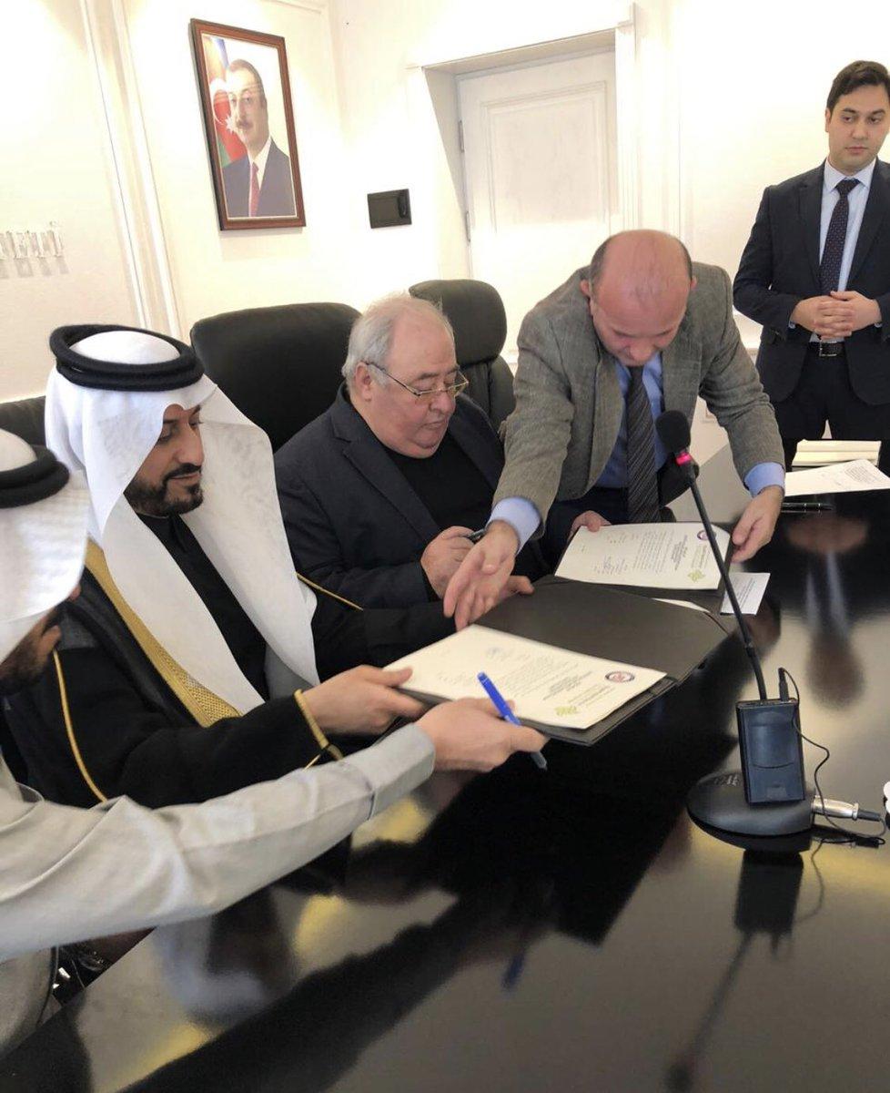 حضر اليوم سعادة سفير خادم الحرمين الشريفين الدكتور حمد بن عبدالله بن خضير توقيع اتفاقية تأسيس مركز الإستعراب بين مركز الملك عبدالله بن عبدالعزيز الدولي لخدمة اللغة العربية المتمثله بالأمين العام الدكتور عبدالله الوشمي وجامعة باكو أوروآسيا المتمثلة بالبروفيسور/ ناظم حسينلي.