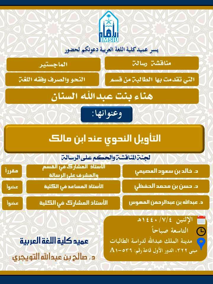 | دعوة لحضور مناقشة رسالة الماجستير" الأم في الرواية السعودية" بجامعة الإمام | مصطفى شعبان | أخبار ومناسبات لغوية | 0 | 09-04-2018 04:54 PM |