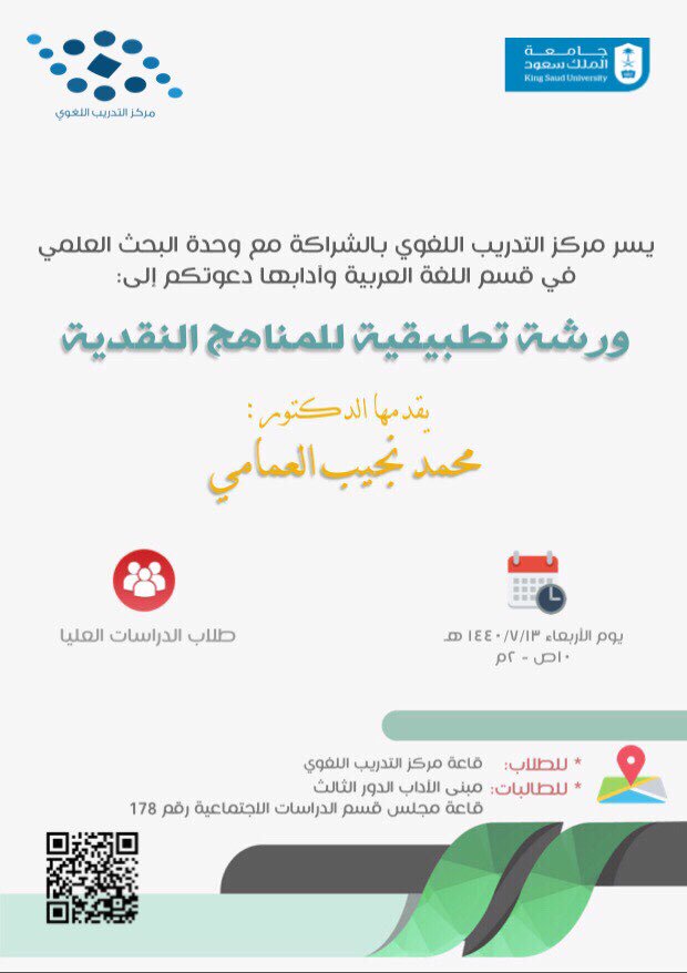 | مركز التدريب اللغوي بجامعة الملك سعود يقدم دورة بعنوان: ( التحليل البلاغي) | مصطفى شعبان | أخبار ومناسبات لغوية | 0 | 03-17-2019 07:46 AM |