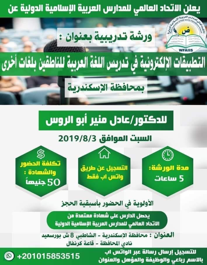 يقيم الاتحاد العالمي للمدارس العربية الإسلامية الدولية ورشة تدريبية بعنوان: "تطبيقات إلكترونية في تدريس اللغة العربية للناطقين بلغات أخرى" والتي ستقام في الإسكندرية يوم السبت الموافق 3 أغسطس من الساعة 11 صباحا.