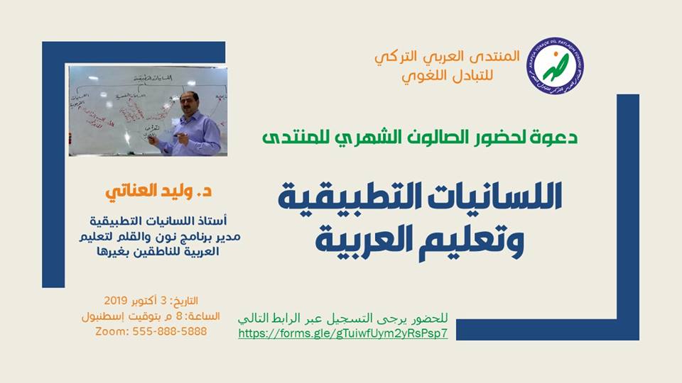 يتشرف المنتدى العربي التركي للتبادل اللغوي بجامعة جيرسون التركية أن يدعوكم لحضور الصالون الشهري للمنتدى والمزمع عقده في 3 أكتوبر 2019 عبر الإنترنت الساعة 8 مساء بتوقيت إسطنبول، والذي يستضيف فيه أستاذ اللسانيات التطبيقية ومدير برنامج نون والقلم لتعليم العربية للناطقين بغيرها: