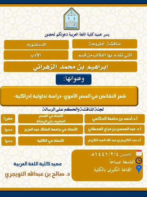 | مناقشة أطروحة الدكتوراه: (بلاغة التناسب في سور المفصل) بجامعة الإمام | مصطفى شعبان | أخبار ومناسبات لغوية | 0 | 04-11-2019 09:25 AM |